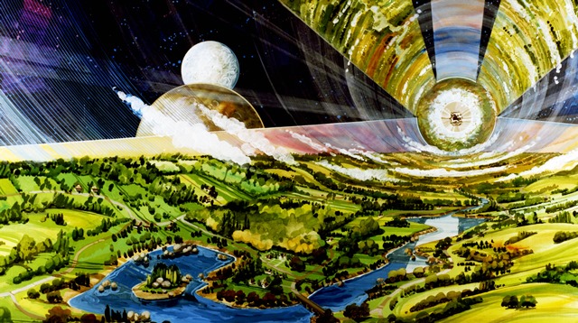 A menudo las cosas no salen de los cilindros, sino que prefieren entrar. El cilindro de O’Neill está pensado para que entren muchas cosas dentro de él: ecosistemas enteros, que crean un mundo interior, una vida. Afuera está el espacio, con su vacío y sus embolias, su radiación mortal, su frescor a 2.7 ºK, mientras que adentro es primavera. Harry Haldeman creó Nueva Nueva York en su Mundos.